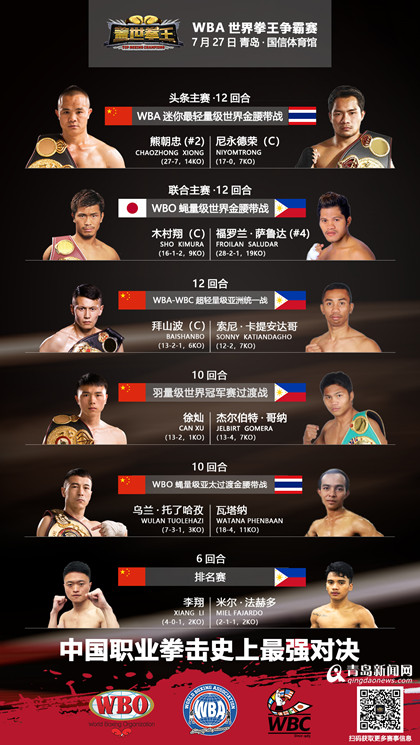 青島新聞網(wǎng)7月17日訊 (記者 劉文超)中國(guó)第一位世界拳王熊朝忠,曾擊敗鄒市明的日本勵(lì)志拳王木村翔即將現(xiàn)身島城,7月27日18時(shí)30分,兩場(chǎng)最頂級(jí)的世界職業(yè)拳王爭(zhēng)霸賽在青島國(guó)信鉆石體育館打響。作為中國(guó)有史以來(lái)最高規(guī)格、最大規(guī)模、最豪華陣容的職業(yè)拳擊盛事,這場(chǎng)備受矚目的“WBA世界拳王爭(zhēng)霸賽”的主賽,將是“中國(guó)拳擊第一人”熊朝忠的第7次世界拳王金腰帶爭(zhēng)霸賽。