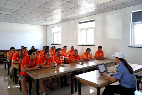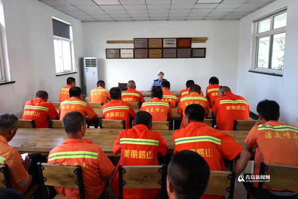 民警王媛媛正在對嶗山區(qū)園林環(huán)衛(wèi)總公司的工人們進行安全培訓(xùn)。