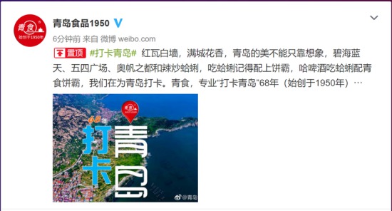 據了解,青島食品股份有限公司的官方微博等新媒體平臺上,當日也同步發(fā)起了#打卡青島#的網絡話題活動、虛擬現(xiàn)實小游戲等系列傳播活動。在青食發(fā)起的這場#打卡青島#的話題內容中可以看到:“青食,專業(yè)打卡青島68年(始創(chuàng)于1950年)”,68年的青食公司似乎借助新媒體的各類互動方式,與消費者走得更近。