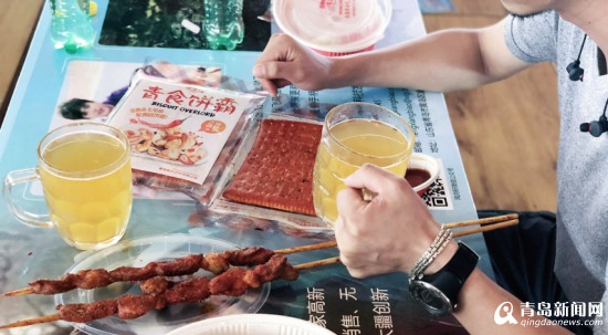 在西海岸啤酒節(jié)餐飲區(qū)域,筆者看到不少游客休憩、用餐時都是“哈啤酒吃蛤蜊配青食餅霸”,而蛤蜊在青島話里其實音同“嘎啦”,青島方言念起來瑯瑯上口,喝一口冰鎮(zhèn)啤酒嚼兩口蛤蜊餅霸,滿滿都是“青島味道”。