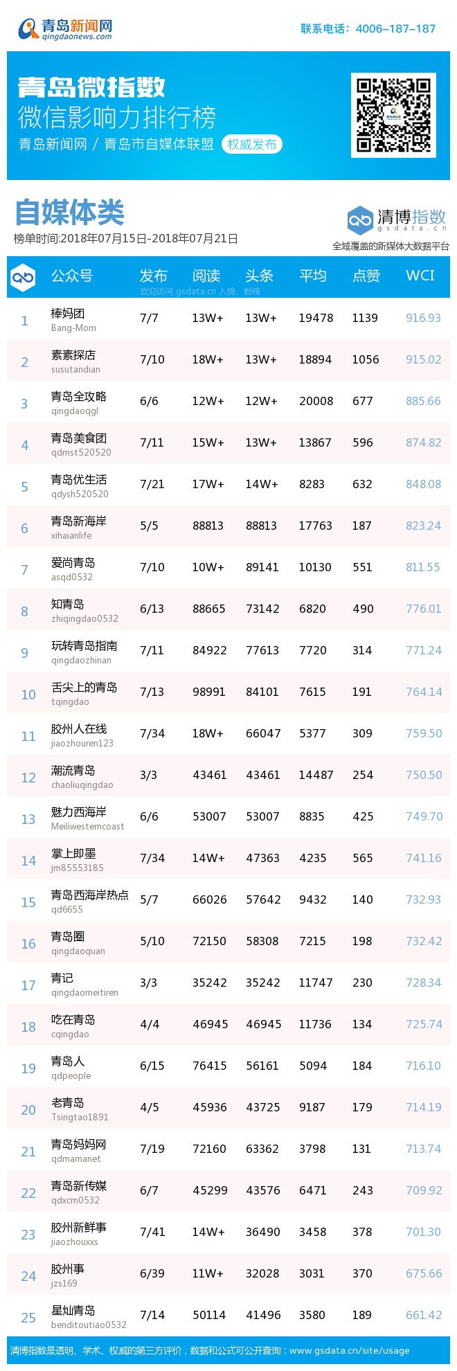 青島新聞網(wǎng)7月23日訊(記者 邢書玲)由青島新聞網(wǎng)、清博指數(shù)平臺聯(lián)手打造的“青島微指數(shù)微信影響力排行榜”今日發(fā)布一周(7.15—7.21)榜單。