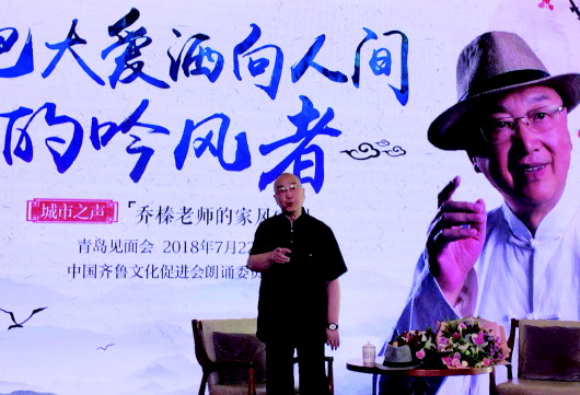 22日上午,76歲高齡的喬榛出現(xiàn)在青島見面會的現(xiàn)場,他笑著用青島話和大家打招呼。雖然身體狀況欠佳,需要拄拐,而且還處于化療期,但喬榛依然興致高昂地與“鐵粉”及朗誦愛好者互動長達兩個半小時。談到動情處,喬榛還用極具辨識度的聲音現(xiàn)場朗誦了經(jīng)典詩歌《小草的心》《雨巷》《蜀道難》《長恨歌》等,他那獨具特色、極為熟悉的“魔音”,一下喚起了現(xiàn)場觀眾沉寂已久的青春記憶,贏得了一次又一次如潮水般的熱烈掌聲?!耙娏舜蠹?我想說點心里話,《小草的心》就是我的內(nèi)心獨白:在所有的生命中間/我是再平常不過的/誰也無法計算出我受過的磨難與委屈/但我絕不想因此而贏得憐憫?!?nbsp;