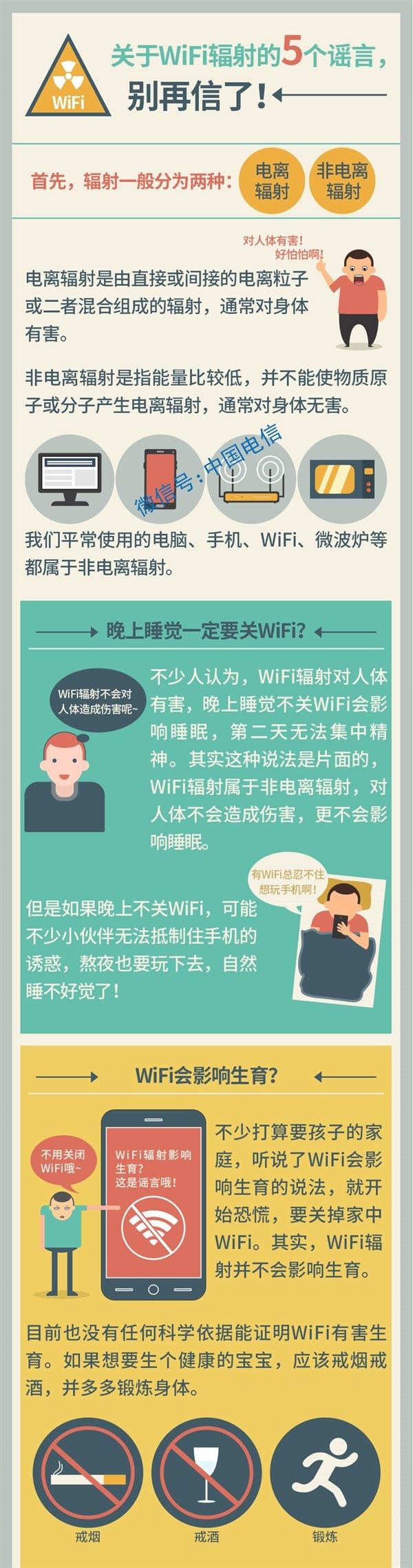 真相:WiFi路由器產(chǎn)生的輻射是非電離輻射,而且輻射劑量非常低,幾乎可以忽略。當然,不關路由器,副作用是很大的,比如說,有了它,你就會想要一直玩手機!所以,要早睡得和手機分房睡。