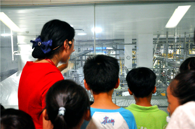 孩子們?cè)谥驹刚叩囊龑?dǎo)下參觀可口可樂(lè)生產(chǎn)線。