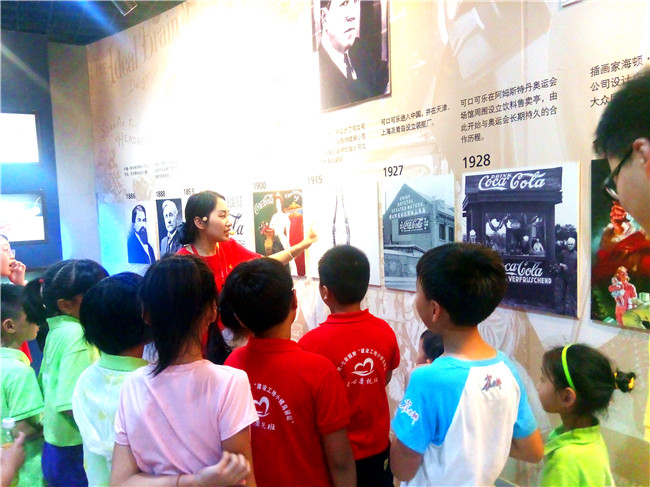 志愿者在給孩子們講解可口可樂(lè)的故事。