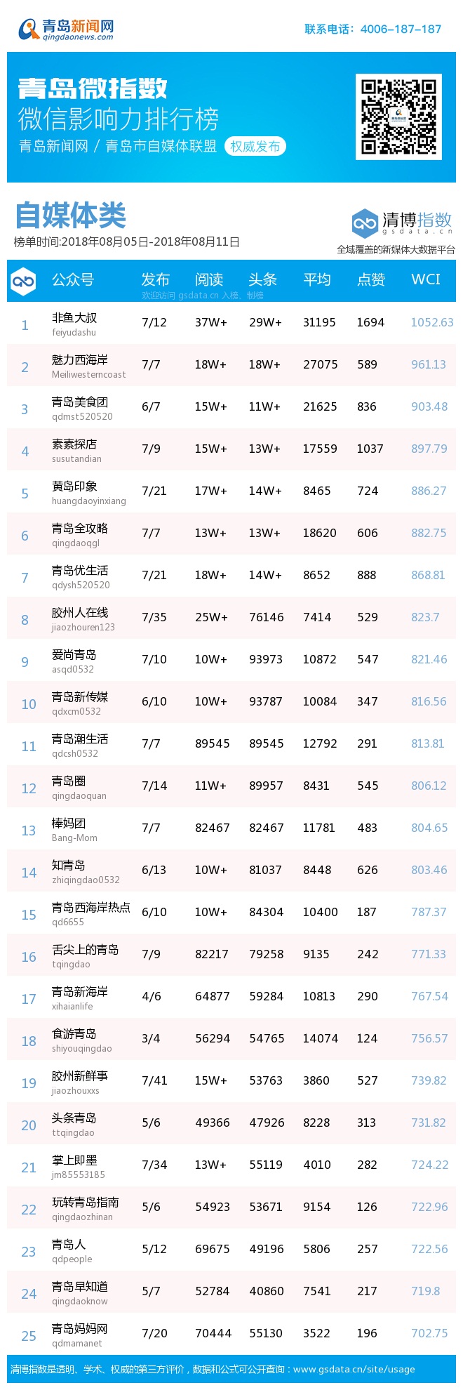 青島新聞網(wǎng)8月13日訊(記者 邢書玲)由青島新聞網(wǎng)、清博指數(shù)平臺聯(lián)手打造的“青島微指數(shù)微信影響力排行榜”今日發(fā)布一周(8月5日-8月11日)榜單。