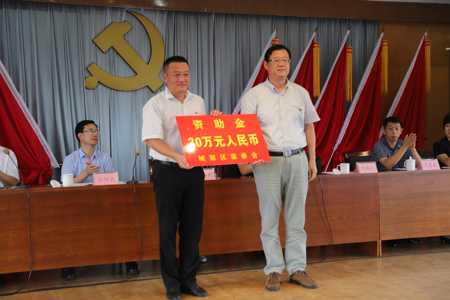 區(qū)慈善會副會長兼秘書長紀瑞禮將“支持基層慈善組織建設資助金”30萬元交接給城陽街道慈善會曹永章會長。