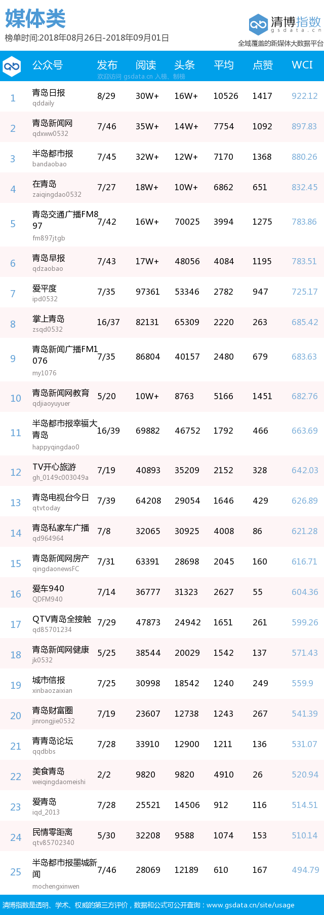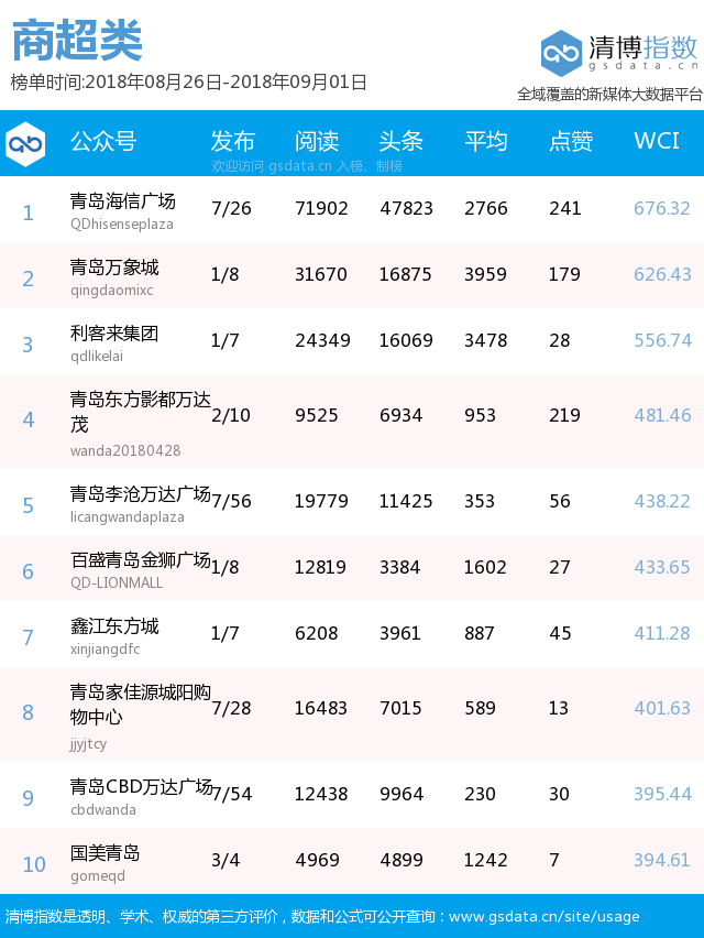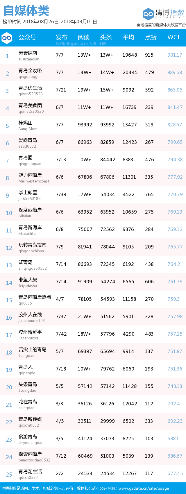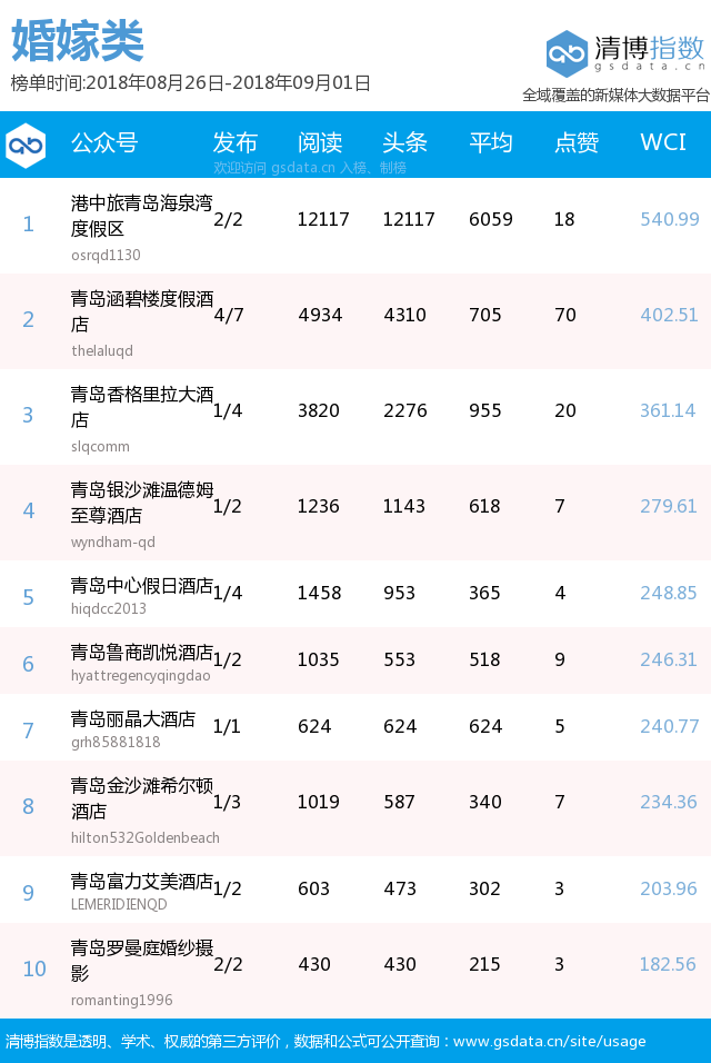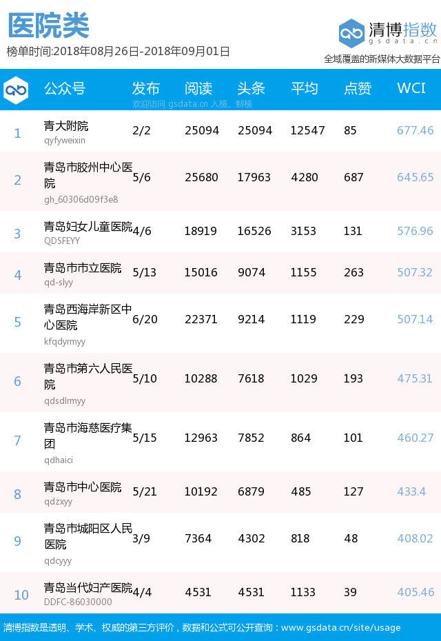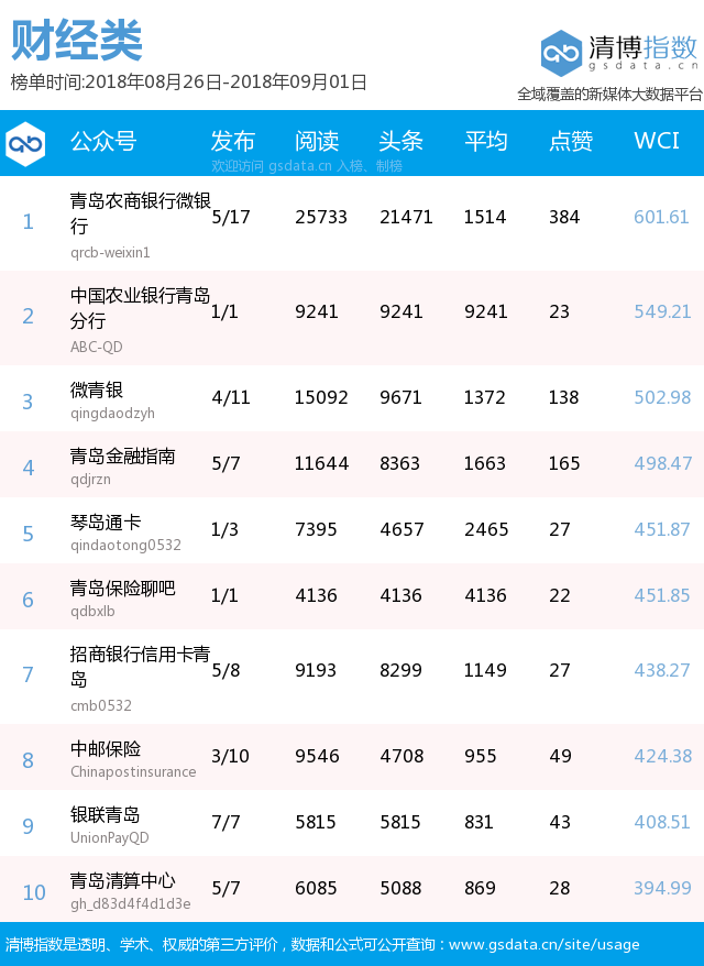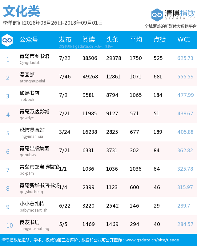 青島新聞網(wǎng)9月3日訊(記者 邢書玲)由青島新聞網(wǎng)、清博指數(shù)平臺(tái)聯(lián)手打造的“青島微指數(shù)微信影響力排行榜”今日發(fā)布一周(8月26日-9月1日)榜單。