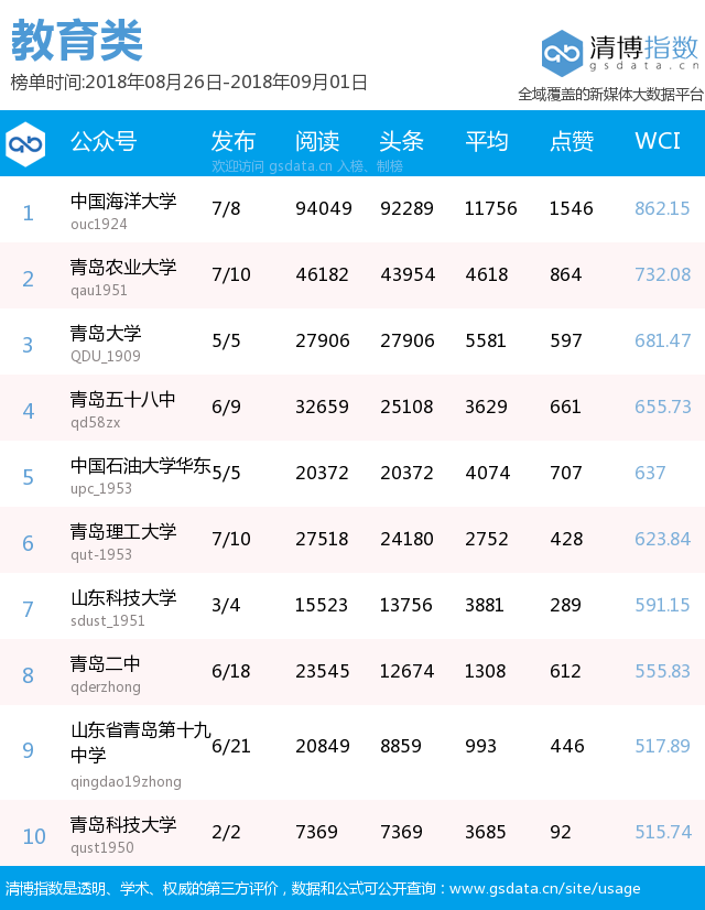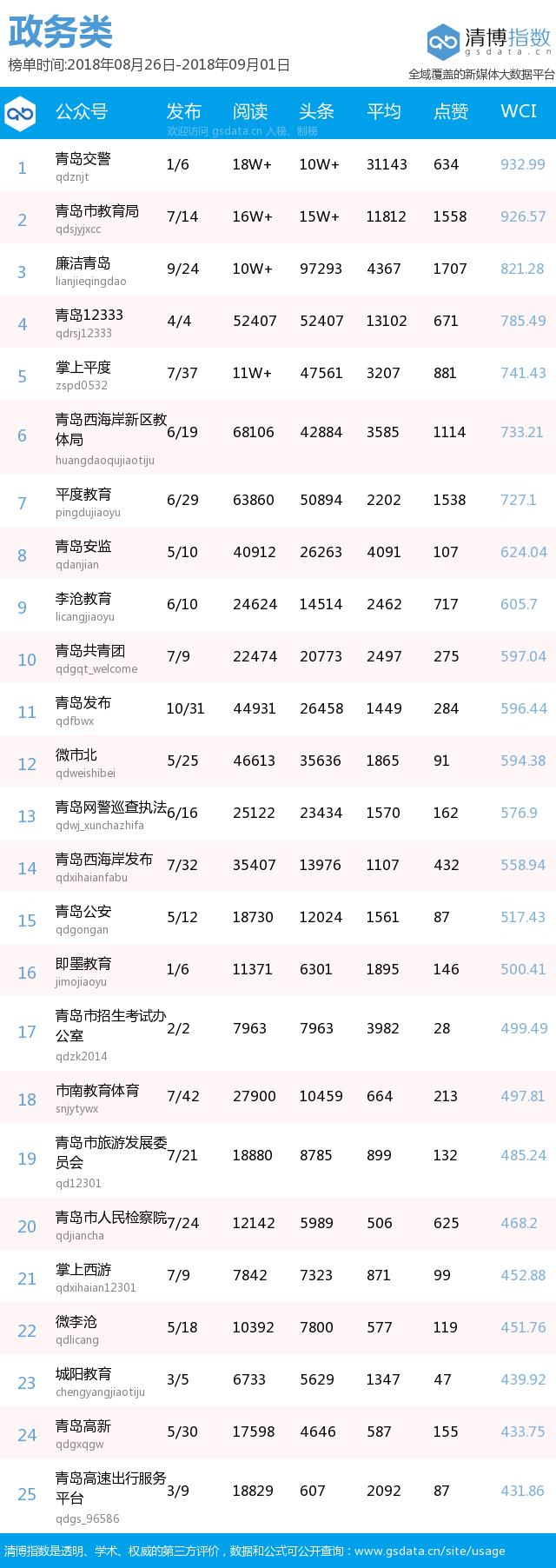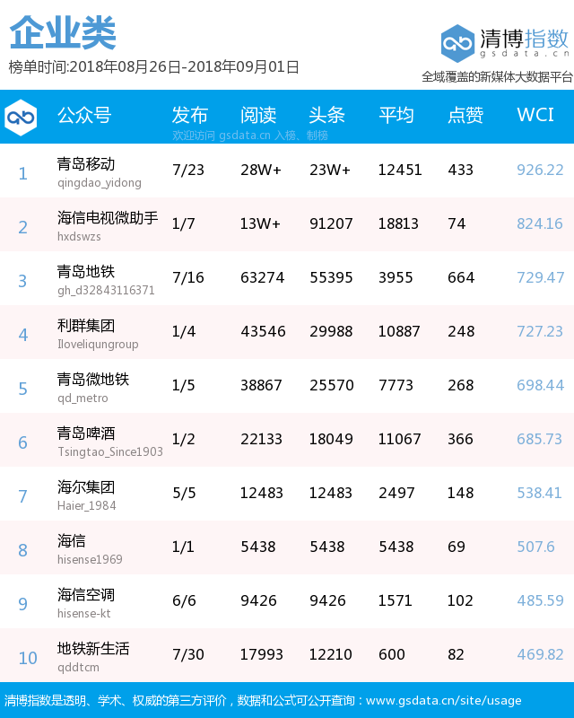 本期政務(wù)榜前五名分別由“青島交警”、“青島市教育局”、“廉潔青島”、“青島12333”、“掌上平度”奪得,其中“廉潔青島”較上期前進(jìn)七個(gè)名次,其發(fā)布的兩起涉黑涉惡典型問題通報(bào),受到市民一致關(guān)注,最終以總閱讀10萬+,點(diǎn)贊1707次的成績(jī),拿下本期第3名。另外,本期政務(wù)榜還收獲兩篇10萬+熱文,分別是“青島市教育局”發(fā)布的“《開學(xué)第一課》節(jié)目單新鮮出爐!今天晚上不見不散”以及“青島交警”發(fā)布的“【回音壁】膠州灣隧道又將有新措施!諸多措施為哪般?”。