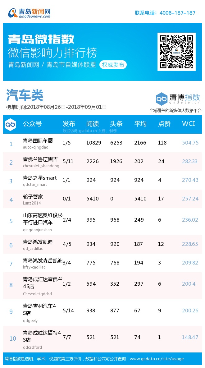 3、本次榜單收錄了青島14個(gè)行業(yè)微信公眾號(hào),如您的賬號(hào)暫未收錄,可聯(lián)系4006-187-187。