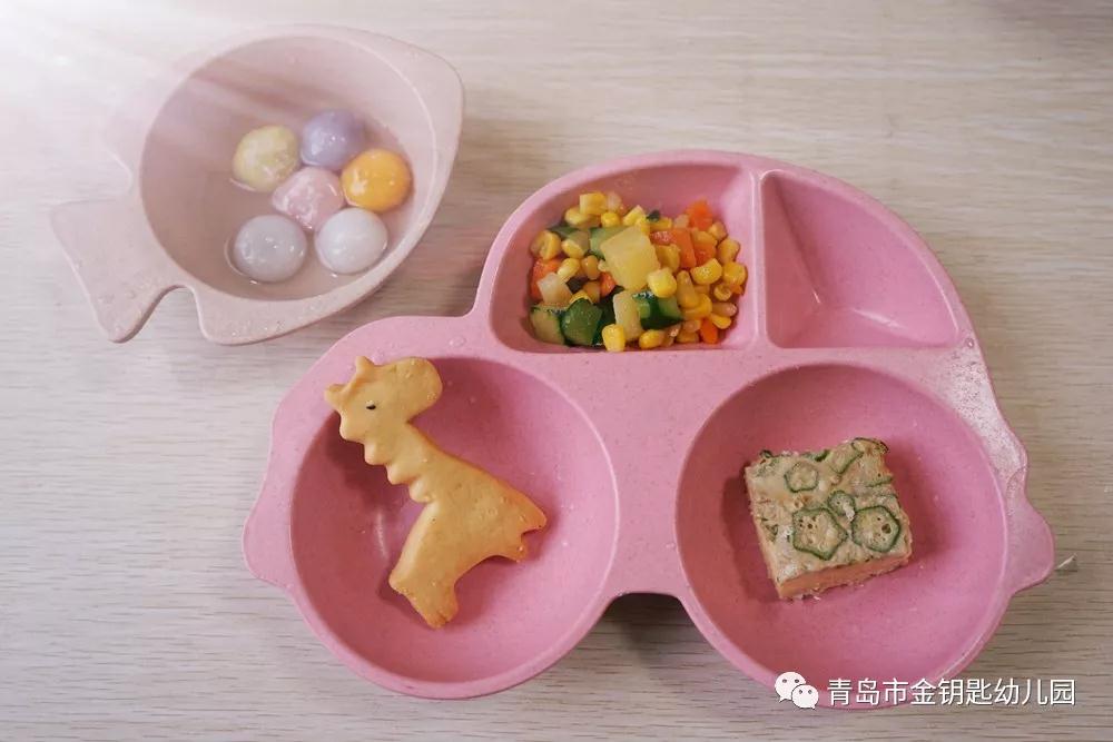 早餐:代表著我們重新相聚、團(tuán)團(tuán)圓圓小湯圓+長高高長頸鹿餅干+鮮蔬雞蛋羹+松子玉米