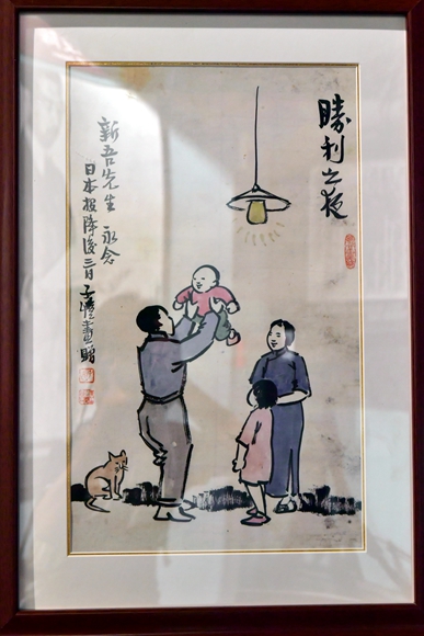 1945年8月15日,日本宣布無條件投降。三天后,豐子愷在重慶創(chuàng)作了這幅《勝利之夜》。豐子愷的畫作本身具有非常高的價(jià)值,在這個(gè)時(shí)間創(chuàng)作的更顯得尤為珍貴。這幅畫尺幅不大,畫中一家四口,父親興奮地高舉幼子,母女在旁面露喜色,連貓瞇似乎也歡伏不已,更村托出喜悅的氛圍。