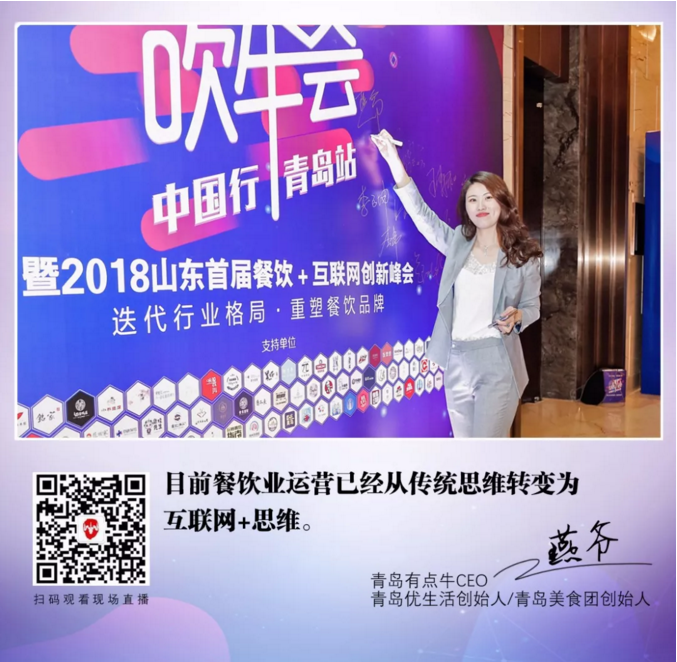 峰會一開始,青島有點牛CEO、青島優(yōu)生活創(chuàng)始人、青島美食團創(chuàng)始人燕爺首先致歡迎辭。她提出,目前餐飲業(yè)運營,已經(jīng)從傳統(tǒng)思維,轉變?yōu)榛ヂ?lián)網(wǎng)+思維。用戶對餐飲的需求,不僅要好吃,還要好看;對環(huán)境的需求,不僅要干凈,還要有逼格!每一個餐飲企業(yè)都應該依托互聯(lián)網(wǎng)營銷,建立自己的大數(shù)據(jù)系統(tǒng),充分發(fā)揮粉絲經(jīng)濟和分享經(jīng)濟的優(yōu)勢!