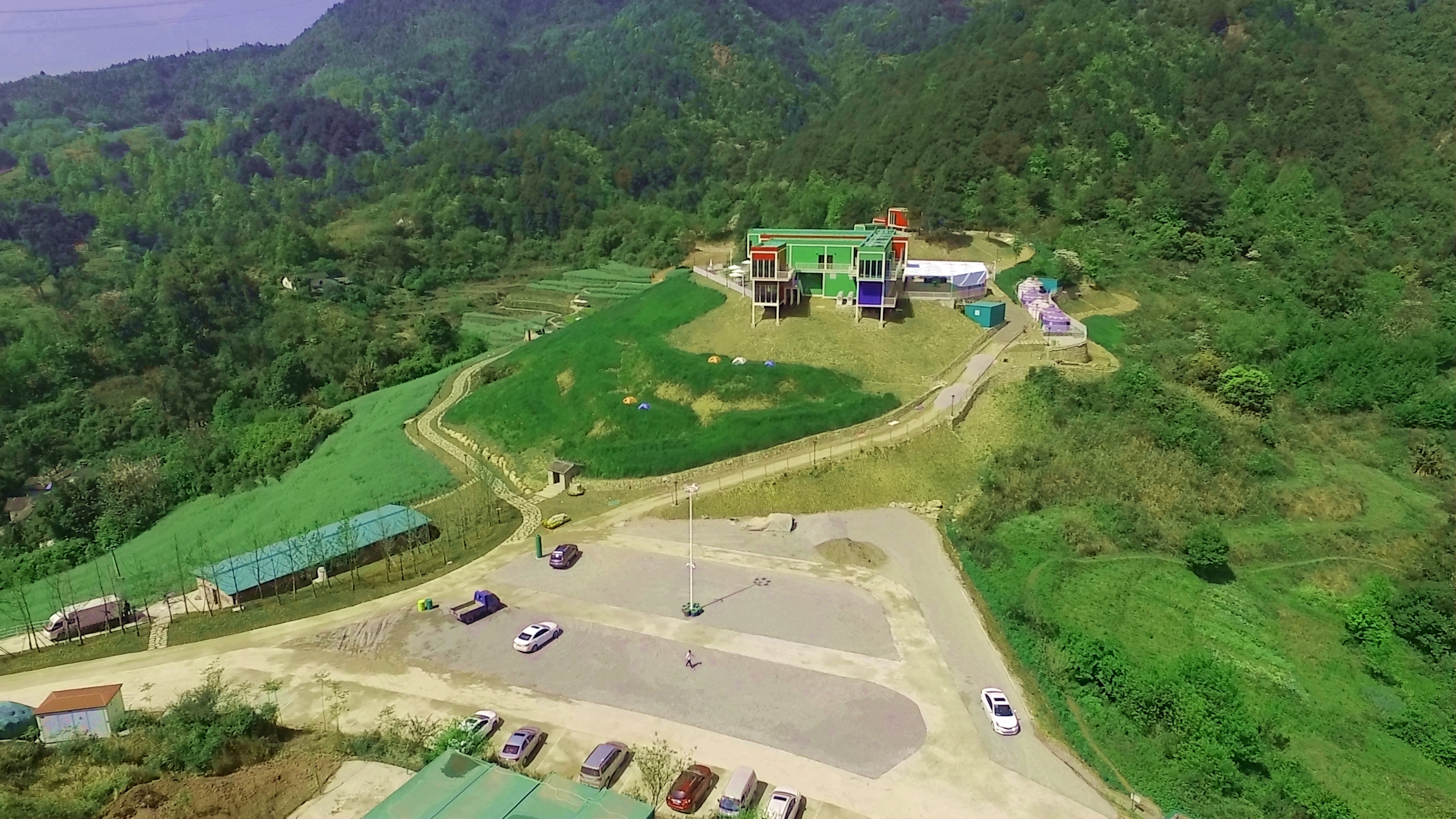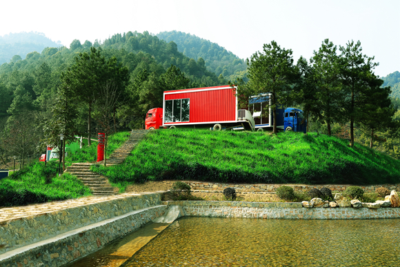 伴煙翠生態(tài)園內(nèi),卡車(chē)房屋與草地綠樹(shù)相映成趣。北碚宣傳部供圖 華龍網(wǎng)發(fā)