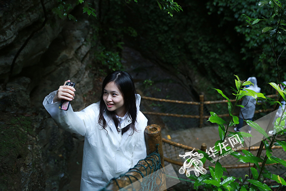 金刀峽的峽谷綠色植被蔥郁,行走在其中就像感受天然的氧吧,記者們正在拍照留念。記者 謝鵬 攝