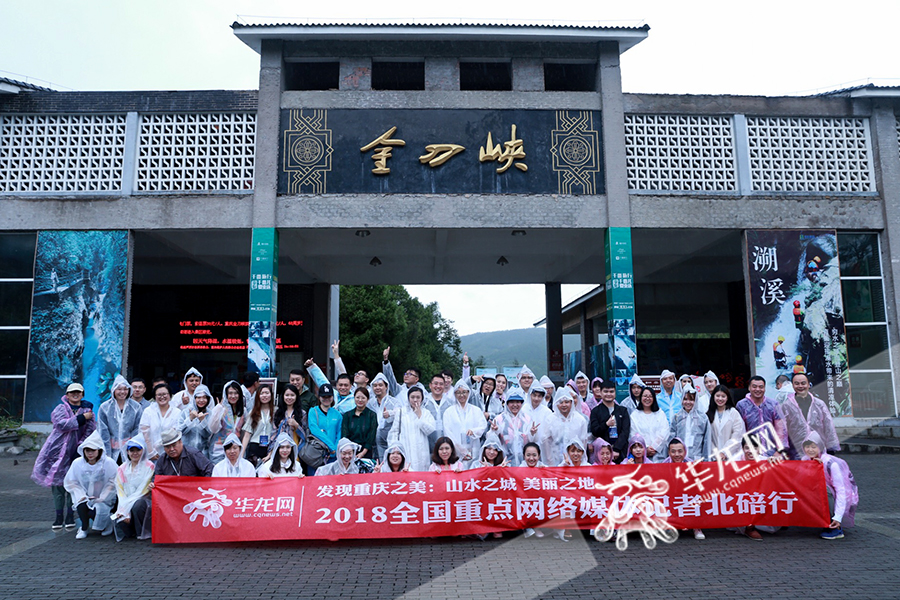 網(wǎng)媒行的記者正在金刀峽景區(qū)門口合影。記者 謝鵬 攝