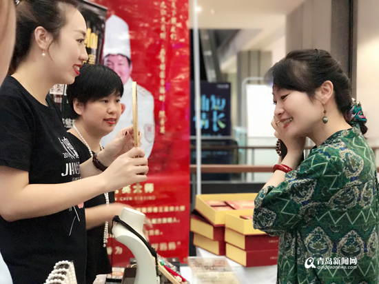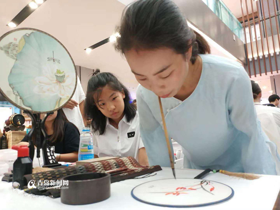 開幕式現(xiàn)場,島城知名口書畫家、玫瑰基金扶持的創(chuàng)業(yè)項(xiàng)目、尚秋書院創(chuàng)始人尚秋女士現(xiàn)場繪制宮扇作品,并拍賣,吸引了眾多家長和孩子的圍觀。提供原創(chuàng)繡制成衣漢服的名繡坊現(xiàn)場走秀,讓現(xiàn)場顧客紛紛拿出手機(jī)拍照,氛圍熱烈……