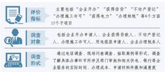 據(jù)了解,《方案》確定的營(yíng)商環(huán)境評(píng)價(jià)指標(biāo)主要包括“企業(yè)開(kāi)辦”“獲得信貸”“不動(dòng)產(chǎn)登記”“辦理施工許可”“獲得電力”“辦理納稅”等6個(gè)方面17個(gè)子項(xiàng)目。調(diào)查對(duì)象包括企業(yè)開(kāi)辦申請(qǐng)人、企業(yè)獲得貸款人、不動(dòng)產(chǎn)登記人、辦理施工許可人、用電報(bào)裝申請(qǐng)人、企業(yè)辦理稅務(wù)人。通過(guò)電話調(diào)查、現(xiàn)場(chǎng)問(wèn)卷調(diào)查、抽取案例等形式,調(diào)查了解具體辦事環(huán)節(jié)所涉及部門(mén)審批和相關(guān)供電、銀行等企業(yè)服務(wù)的實(shí)際時(shí)間、辦理成本、申請(qǐng)材料件數(shù)和滿意度。