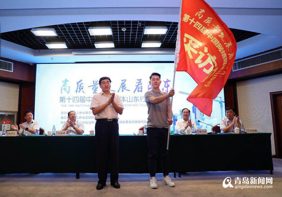 啟動(dòng)儀式上,中共山東省委宣傳部常務(wù)副部長(zhǎng)王紅勇為采訪(fǎng)團(tuán)授旗,采訪(fǎng)團(tuán)成員代表人民日?qǐng)?bào)社新媒體中心溫騰接旗,“高質(zhì)量發(fā)展看山東——第十四屆中國(guó)網(wǎng)絡(luò)媒體山東行”大型采訪(fǎng)活動(dòng)正式啟動(dòng)。
