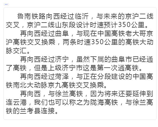魯南高鐵項(xiàng)目建成后向西在曲阜與京滬高鐵相接,經(jīng)濟(jì)寧、菏澤、蘭考連接正在建設(shè)的徐州-蘭考-鄭州、已建成的鄭州至西安、西安至寶雞和正在建設(shè)的寶雞至蘭州客專,青島連通內(nèi)陸腹地將再添一條快速通道。
