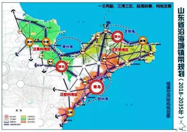 其中“一主兩副”以青島為中心,煙臺、濰坊為副中心。以膠州灣、芝罘灣、萊州灣為重點,大力發(fā)展灣區(qū)經(jīng)濟,統(tǒng)籌推進(jìn)青日、煙威、東濱濰沿海城鎮(zhèn)一體化建設(shè)。