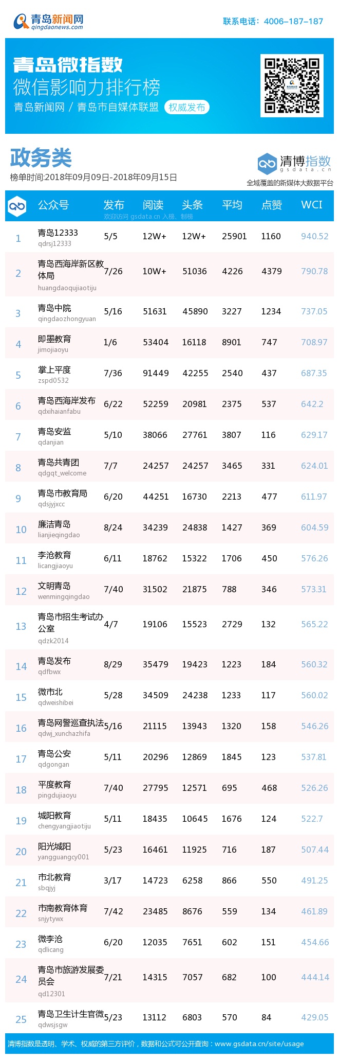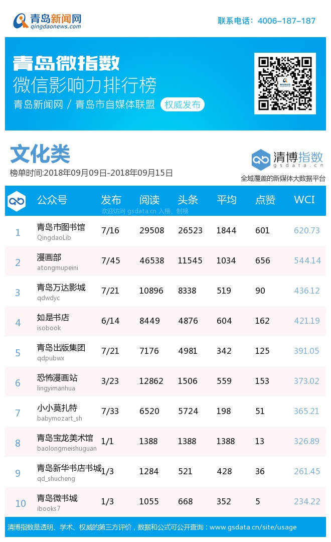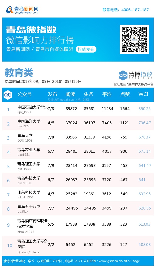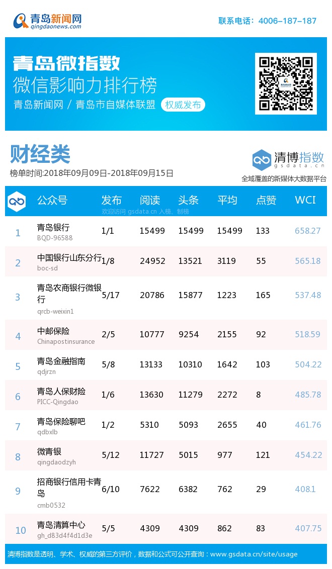 青島新聞網(wǎng)9月17日訊(記者 邢書玲)由青島新聞網(wǎng)、清博指數(shù)平臺聯(lián)手打造的“青島微指數(shù)微信影響力排行榜”今日發(fā)布一周(9月9日-9月15日)榜單。