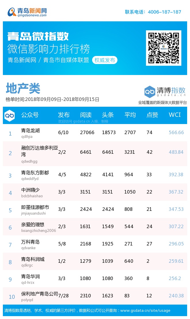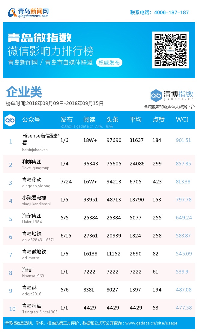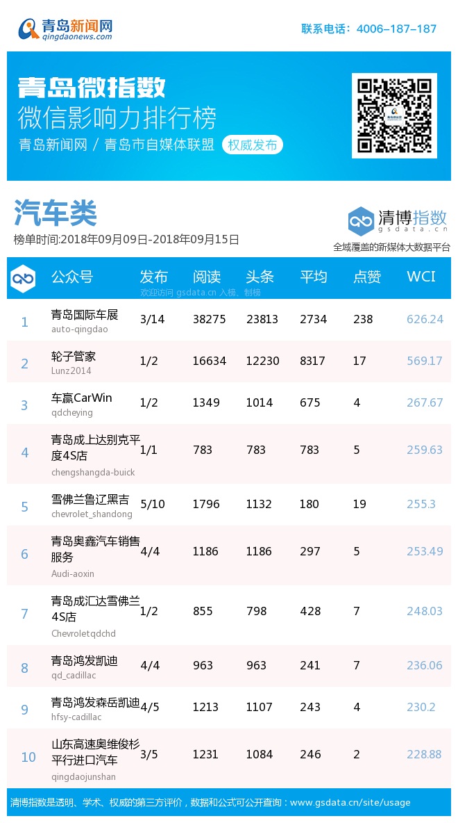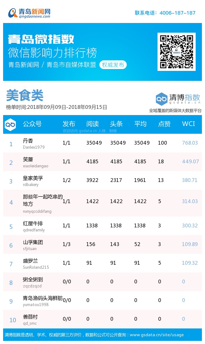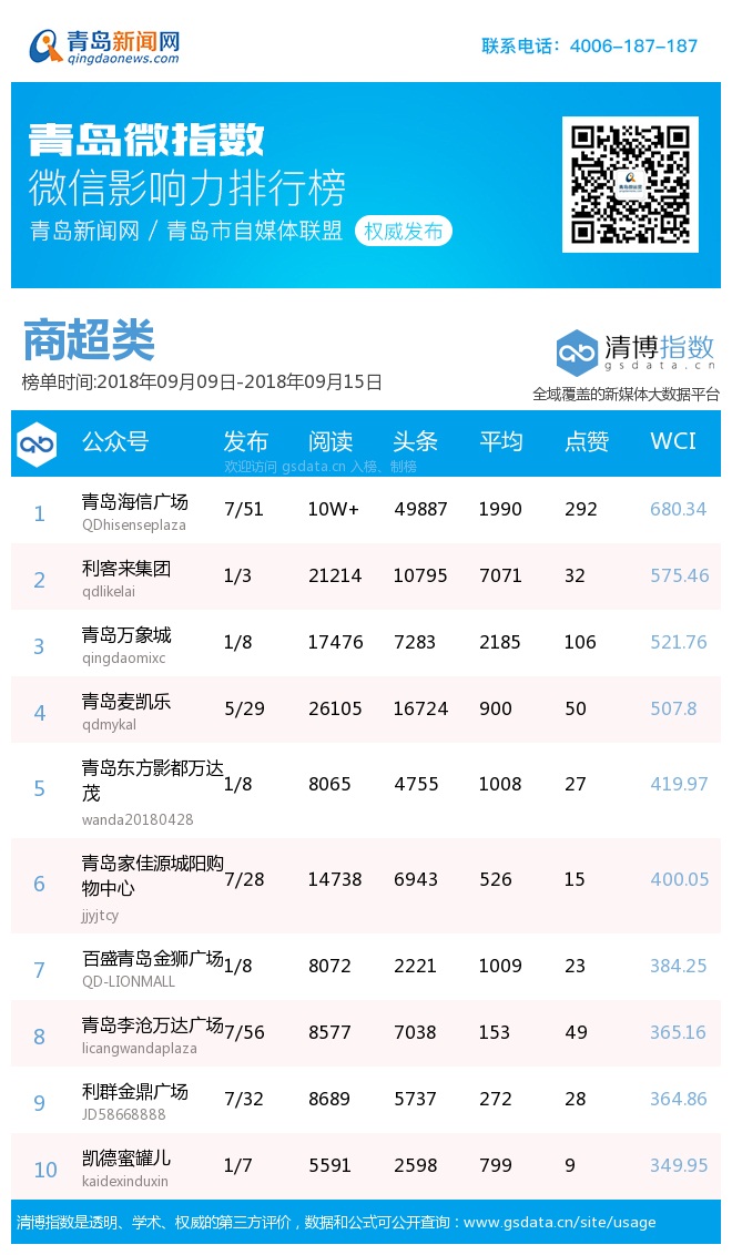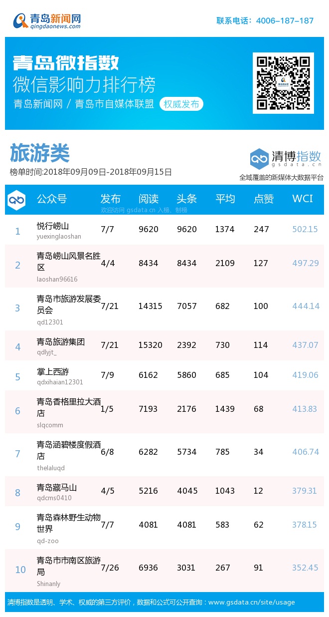 3、本次榜單收錄了青島14個行業(yè)微信公眾號,如您的賬號暫未收錄,可聯(lián)系4006-187-187。