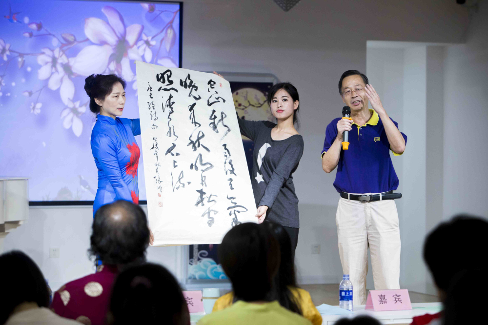 當晚,青島國學會會長張文、禪院院長張川、書法家孫綱老師也親臨現場,以筆代心,為大家書寫美好祝福,并送給現場幸運觀眾。在詩會的互動環(huán)節(jié)中,青島市首屆詩詞高手冠軍胡鵬、2018青島“漢風國韻”詩詞大會“詩王”侯英喜、殷瑞璟等老師,現場為大家普及“飛花令”傳統(tǒng)文化知識,和大家共同體驗“飛花令”的樂趣。