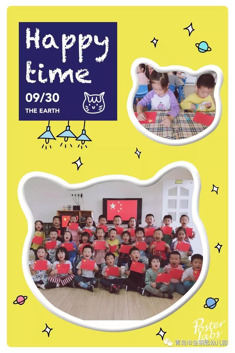 國旗國旗紅紅的哩,五顆金星黃黃的哩,升在天空高高的哩,我們心中甜甜的哩。稚嫩的小手制作出一面面五星紅旗,我們長在紅旗下,幸福安康祝國慶!