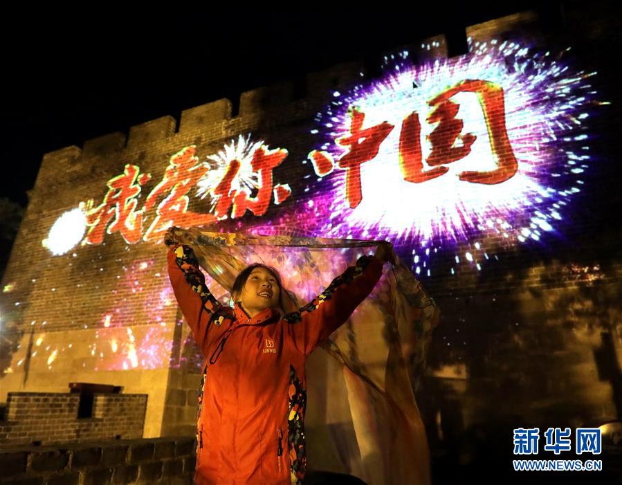 9月30日,一名兒童在“我愛你中國”字樣前起舞。當(dāng)日,一場美輪美奐的“我愛你中國”燈光秀在北京八達(dá)嶺長城上演。新華社記者 李德欣 攝
