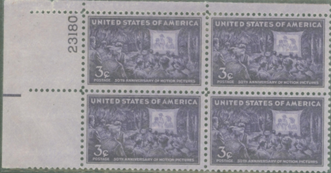 1944年美國發(fā)行的世界第一枚有關(guān)電影題材的紀(jì)念郵票《士兵看電影》