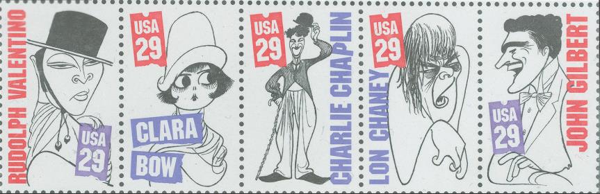 1994年美國發(fā)行的一組10枚以漫畫形式表現(xiàn)默片時代電影明星的紀(jì)念郵票這組郵票隱藏著一個秘密:在設(shè)計這些郵票時,設(shè)計師艾爾·赫奇菲的女兒恰好出生,于是他將女兒的名字“NINA”融入在人物線條中
