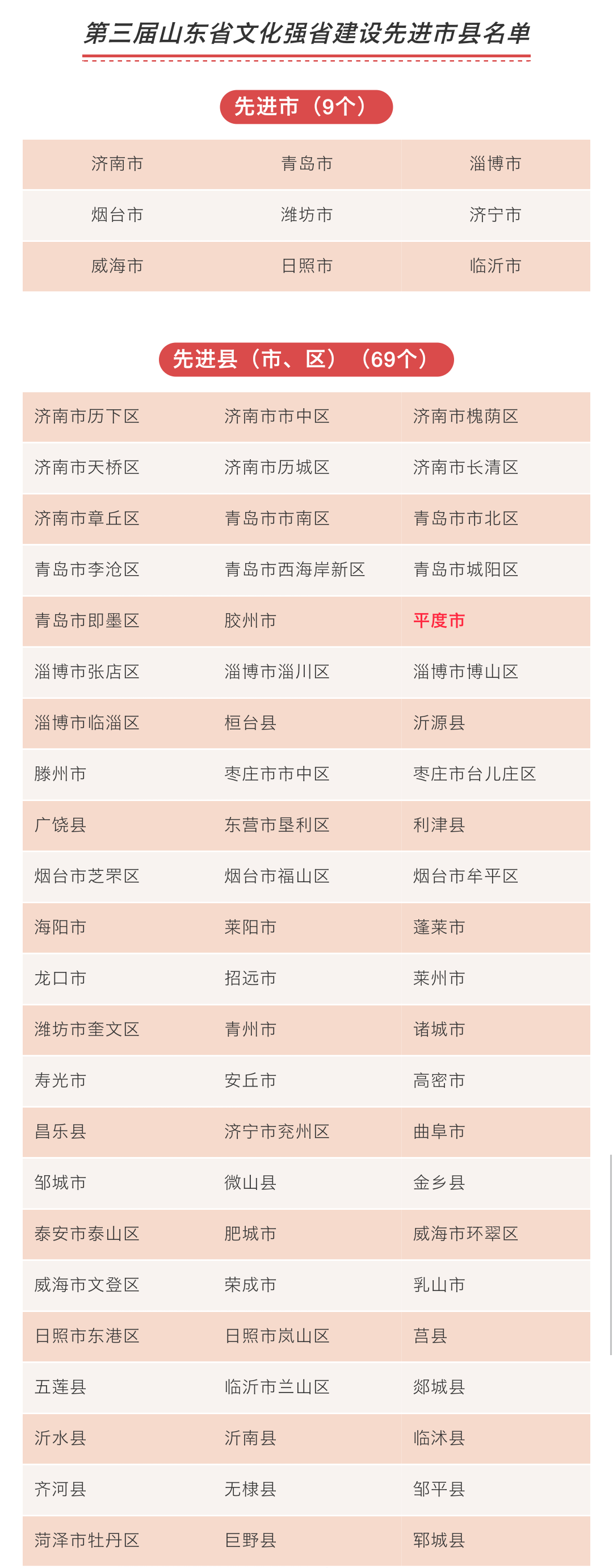 活動現(xiàn)場,第三屆山東省文化強省建設(shè)先進(jìn)市縣名單正式公布,共評出9個先進(jìn)市、69個先進(jìn)縣(市、區(qū)),具體名單如下: