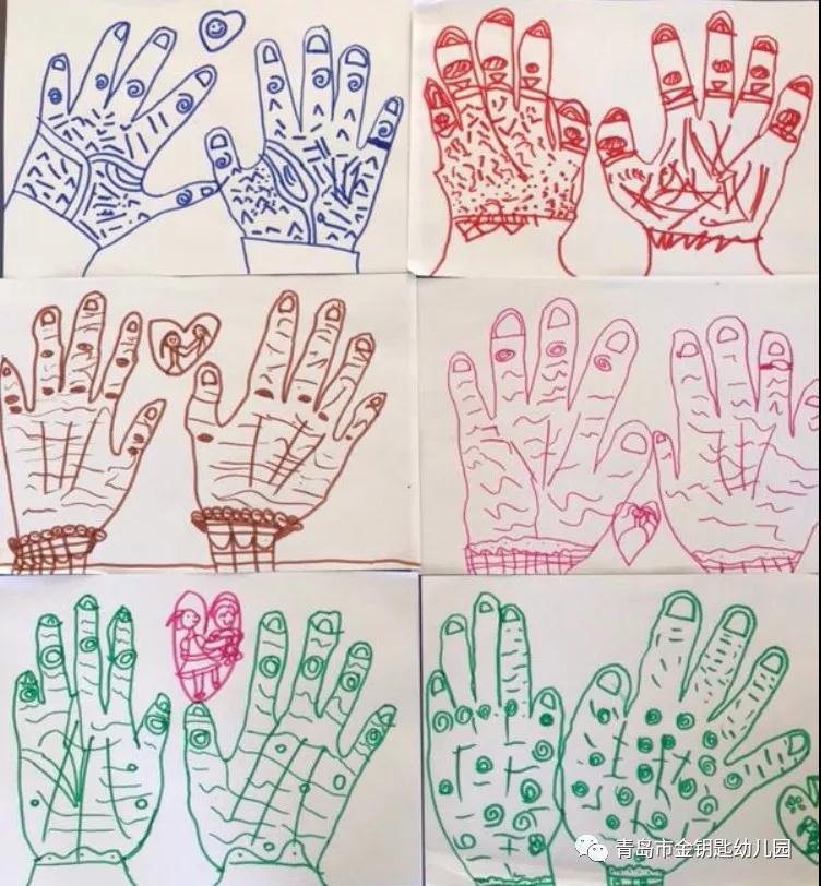 請孩子為家里的老人洗洗手,在參與的過程中孩子用眼睛看,也用敏感細膩的心靈感受到了老人們手的粗糙、操勞一生的不易。當他們拿起畫筆,也就學會了“愛的表達”。
