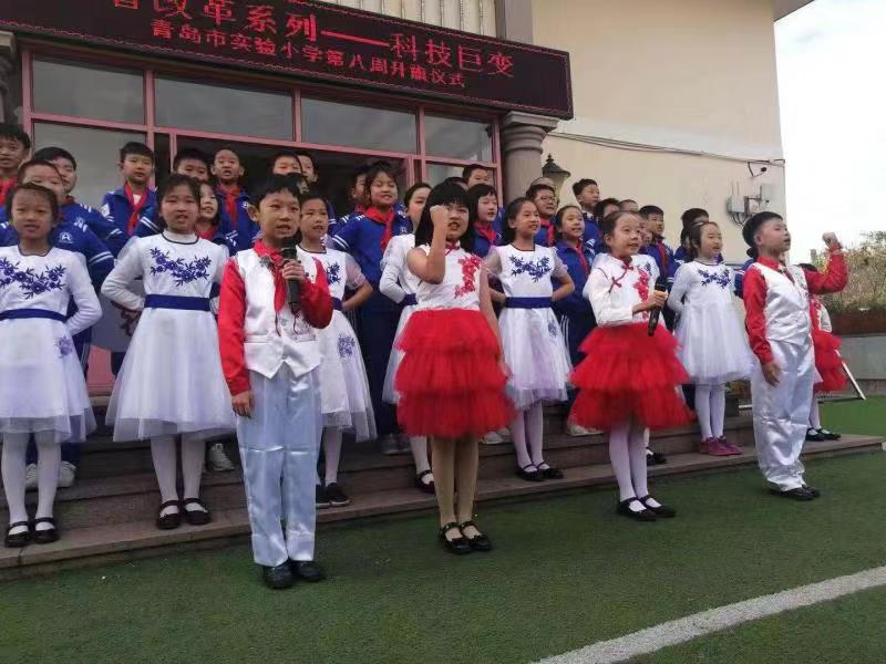 周一,青島市實驗小學三年級一班的同學們在學校升旗儀式上,朗誦改革開放40年科技變化的兒童詩歌。