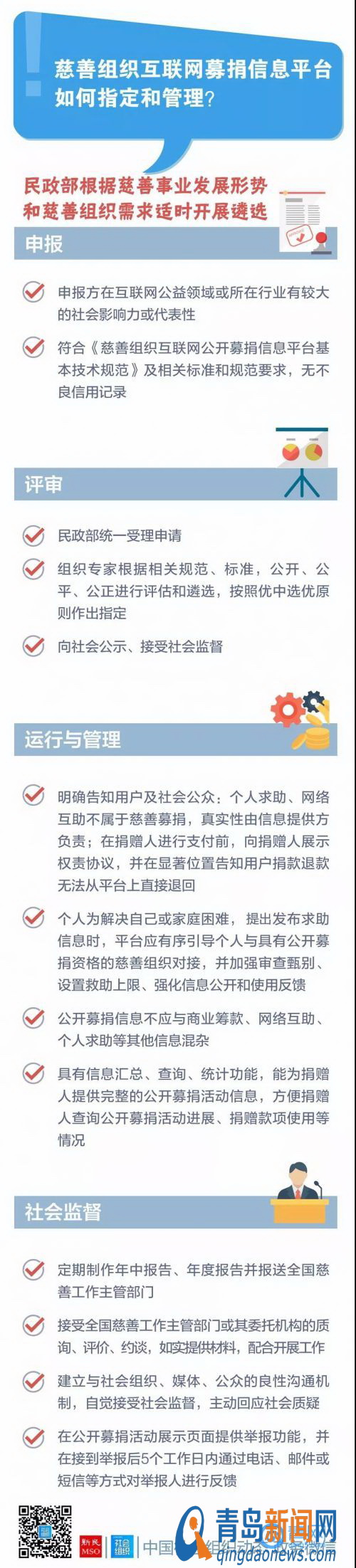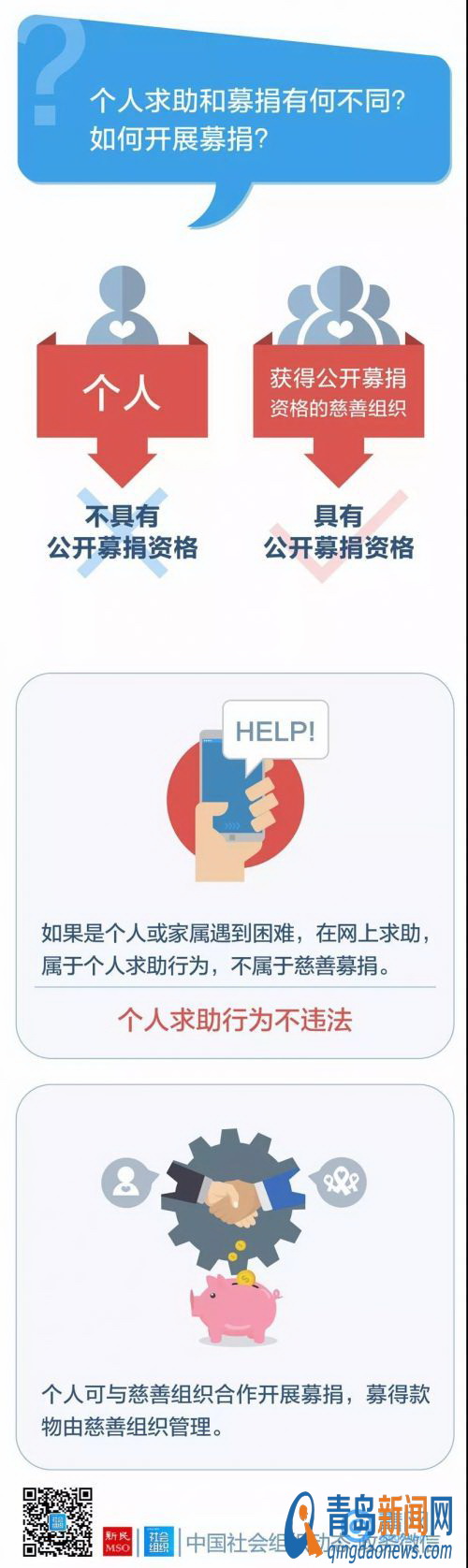 青島新聞網(wǎng)10月26日訊 慈善組織公開募捐如何開展?個(gè)人求助與慈善募捐有何區(qū)別?民政部指定的互聯(lián)網(wǎng)公開募捐信息平臺(tái)有哪些?本套圖解知識(shí)卡一一解答!