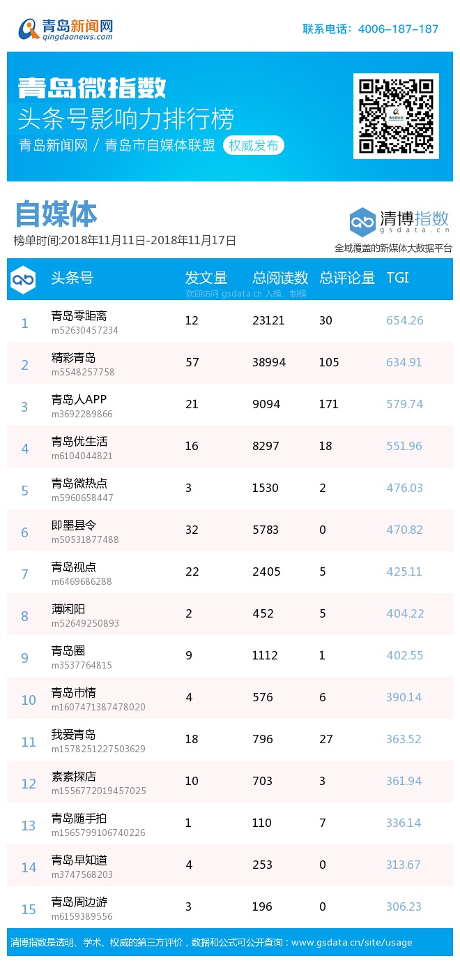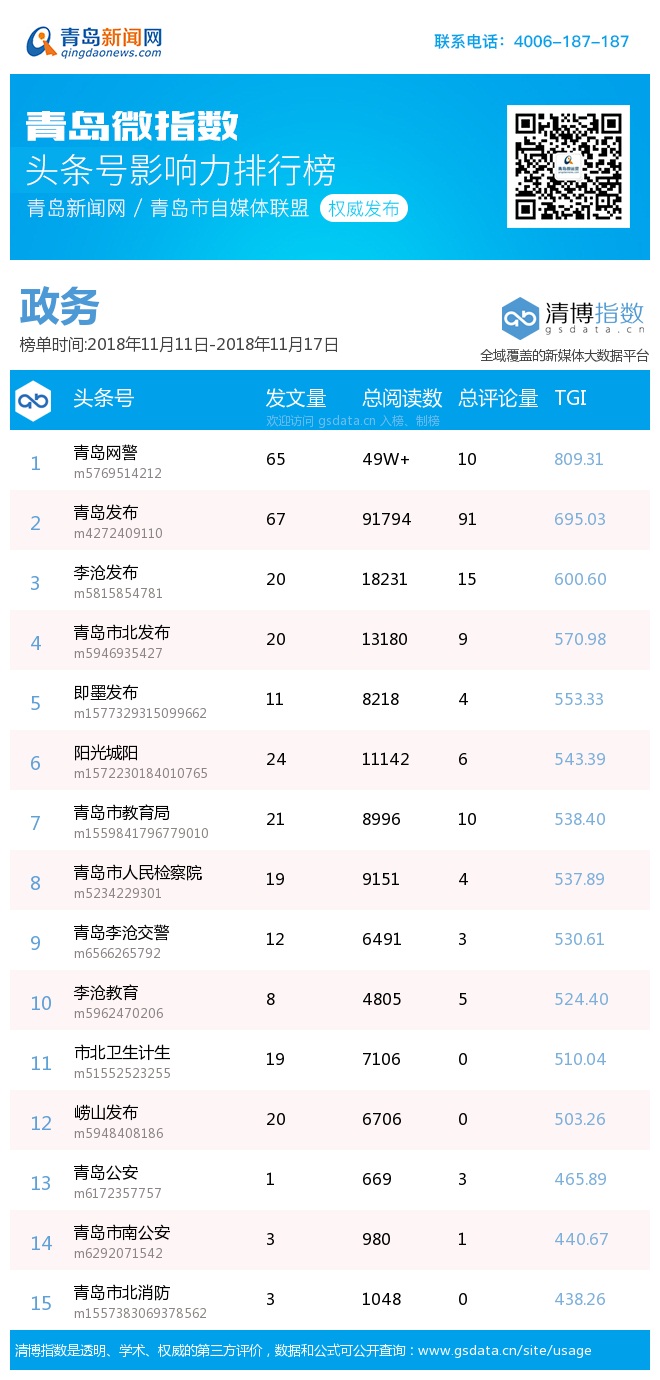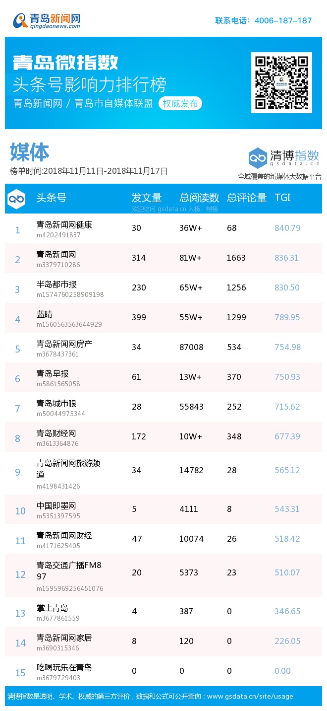青島新聞網(wǎng)11月20日訊(記者 邢書玲)由青島新聞網(wǎng)、清博指數(shù)平臺(tái)聯(lián)手打造的“青島微指數(shù)頭條號(hào)影響力排行榜”今日發(fā)布一周(11月11日-11月17日)榜單。