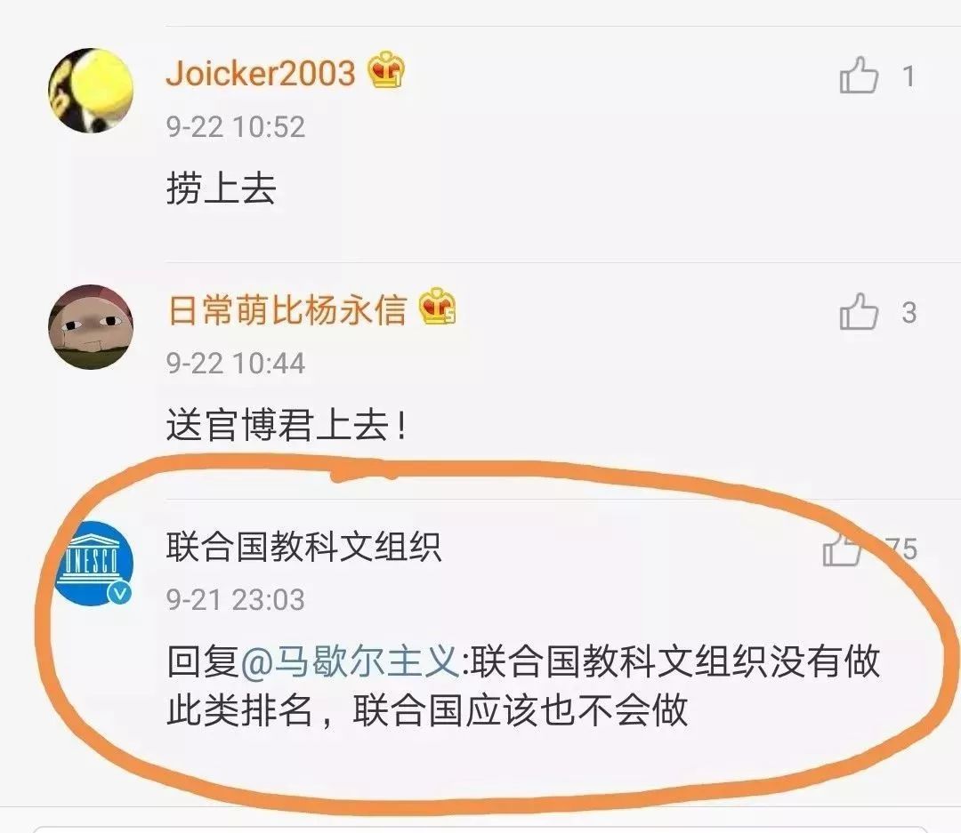 諷刺的是,“杜猛”還在微博最開始加了句“我先聲明一下,可能是聯(lián)合國(guó)教科文組織在造假?你忍心一下看完。”結(jié)果聯(lián)合國(guó)教科文組織的官方微博當(dāng)天就出來(lái)“強(qiáng)力打臉”,聲明“聯(lián)合國(guó)教科文組織沒有做此類排名,聯(lián)合國(guó)應(yīng)該也不會(huì)做。”這條微博被多名網(wǎng)友舉報(bào),微博管理方最后對(duì)其做了“不實(shí)”的標(biāo)記,對(duì)博主禁言15天,但這條假消息并未被刪,仍然掛在那里,甚是刺眼。而作者在被處理前還接著轉(zhuǎn)發(fā)了好幾條貶低中國(guó)的評(píng)論。