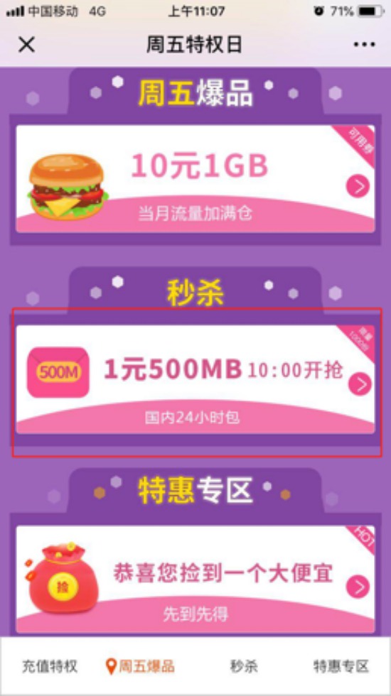 第五步:每周五10:00,還可參與1元搶購500MB24小時包活動,搶購份數(shù)以當前頁面為準,搶完為止。