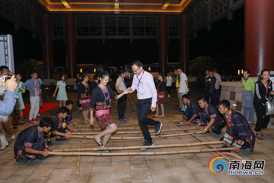 昌江黎族自治縣旅游資源推介會開始前,網(wǎng)媒嘉賓體驗竹竿舞。南海網(wǎng)記者李昊攝