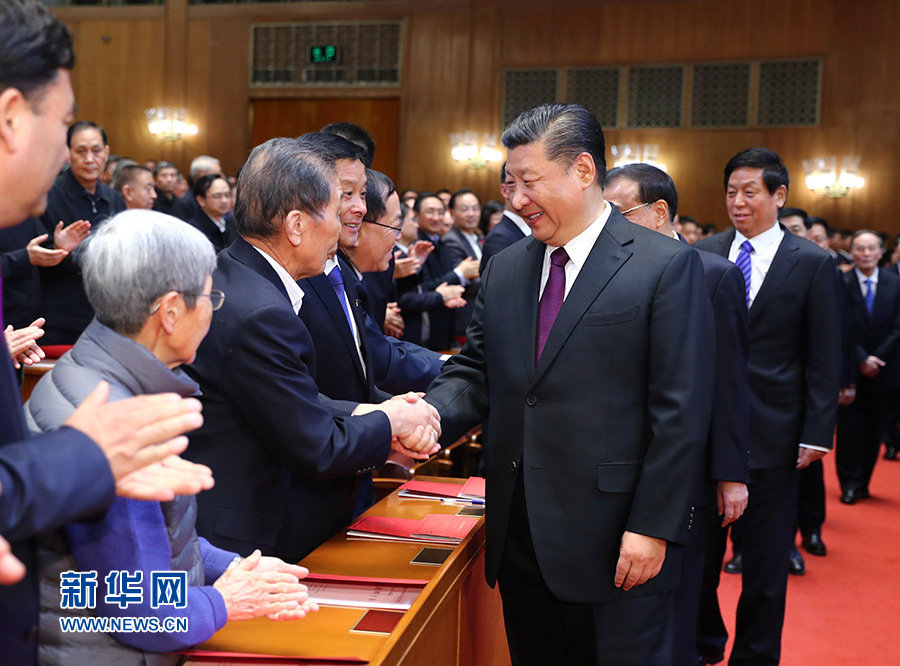 19時(shí)55分,在歡快的樂曲聲中,習(xí)近平等領(lǐng)導(dǎo)同志步入大禮堂,與改革開放杰出貢獻(xiàn)受表彰人員代表親切握手,向他們致以崇高敬意,全場(chǎng)響起熱烈掌聲。