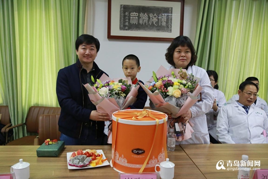 山東大學(xué)齊魯醫(yī)院(青島)接診的第一位住院病人前來醫(yī)院祝賀。