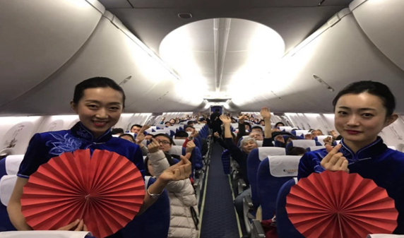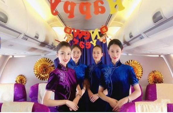 熱鬧的登機音樂配合著乘務員們喜慶的紅旗袍,一聲聲“新年好,歡迎乘機!”瞬間讓旅客們被濃厚的新年氛圍所包圍??团摾飸覓斓男〖t燈籠和氣球拉花,乘務員臉上綻放著溫暖甜美的笑容,無一不在渲染著新年的新氣象,2019年1月1日SC4781青島-重慶新年送祝福之旅由此開啟。
