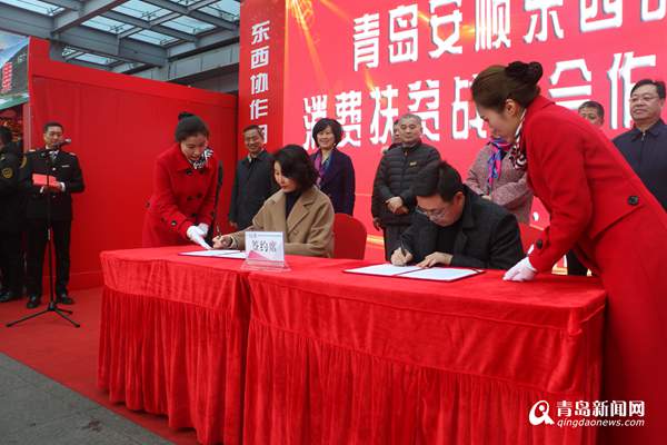安順市商務局局長李猛、交運集團黨委書記、董事長劉永康先后致辭,安順市農(nóng)委總農(nóng)藝師艾勇作了安順特色農(nóng)產(chǎn)品的介紹。隨后,兩市領(lǐng)導和現(xiàn)場市民共同見證了安順市總工會與青島利群集團簽訂戰(zhàn)略合作協(xié)議,交運集團、城陽區(qū)安順扶貧協(xié)作農(nóng)產(chǎn)品店、青島廣電集團府新安順特產(chǎn)店、李滄李村茶葉批發(fā)市場,分別與貴州綠野芳田有限公司簽訂戰(zhàn)略合作協(xié)議。最后,安順市人大常委會副主任、市總工會主席羅曉紅宣布活動正式啟動。