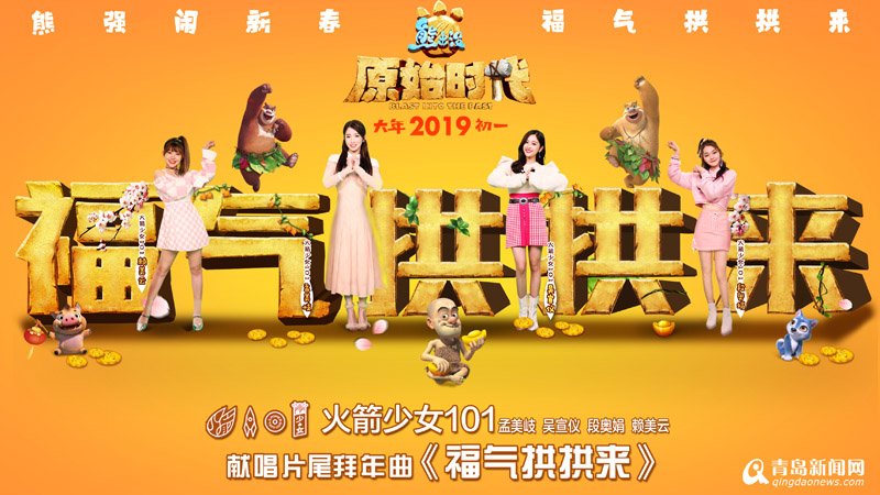 青島新聞網(wǎng)1月15日訊(記者張力偉)定檔2月5日大年初一上映的《熊出沒》第六部大電影《熊出沒·原始時(shí)代》,今日曝光由火箭少女101演唱的新年第一拜年神曲《福氣拱拱來》,同時(shí)發(fā)布歌曲音頻及MV。組合成員孟美岐、吳宣儀、段奧娟、賴美云分別為快樂、福氣、健康、財(cái)運(yùn)“代言”,向觀眾拜年?!缎艹鰶]·原始時(shí)代》將于大年初一2D、3D同步上映,火箭少女101將攜手全新《熊出沒·原始時(shí)代》拜年片尾曲,與觀眾一同迎接2019年春節(jié)的到來。