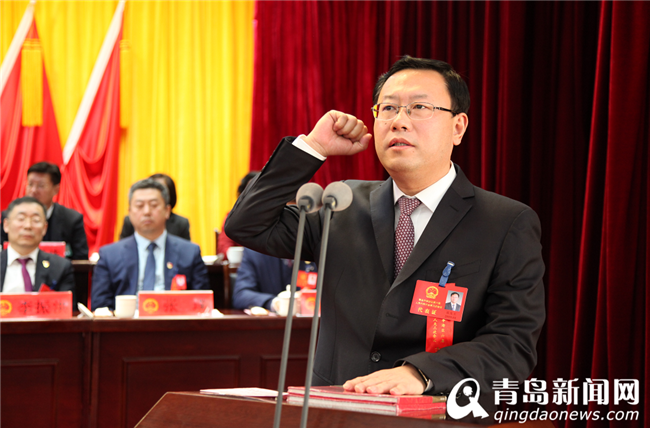 新當(dāng)選的李滄區(qū)人民政府區(qū)長(zhǎng)張友玉向憲法宣誓。