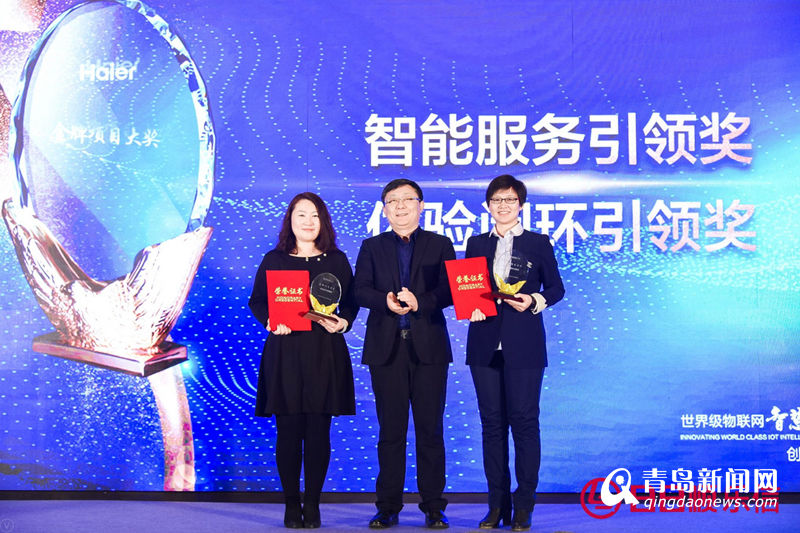 海爾電器產(chǎn)業(yè)副總裁任賢全為日日順樂信項目團隊頒發(fā)獎項。