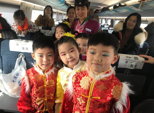 他們的活潑和精彩的表演讓整節(jié)列車洋溢著滿滿的年味。