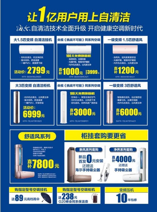 驚喜二、免單禮:海爾空調(diào)30年老用戶,憑發(fā)票(或機(jī)器編號(hào))及照片,可免費(fèi)更換海爾第二代自清潔空調(diào)