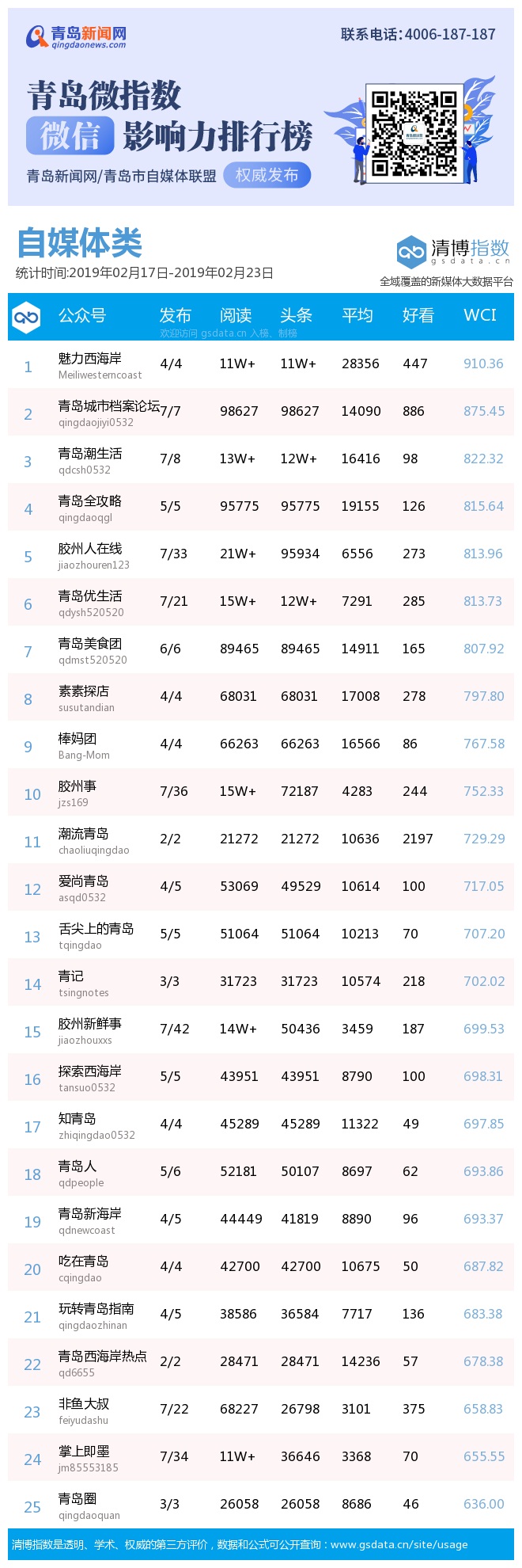 青島新聞網(wǎng)2月25日訊(記者 邢書玲)由青島新聞網(wǎng)、清博指數(shù)平臺聯(lián)手打造的“青島微指數(shù)微信影響力排行榜”今日發(fā)布一周(2月17日-2月23日)榜單。